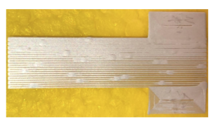 Thinning out can be observed along a trim length. Between trim lengths, ink blobs are used to prevent disconnects but also create short circuits.